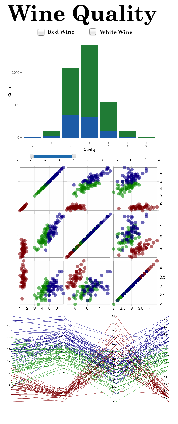 With this chart, I am hoping we can see trends of the types of wines for each quality score. Like the scatter plot matrix, I think it will help us to see relationships between our attributes and be able to show the difference between our white and red wines.